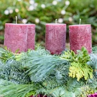 Adventskranz mit durchgefärbten bordeauxfarbenen rustikalen Stumpenkerzen